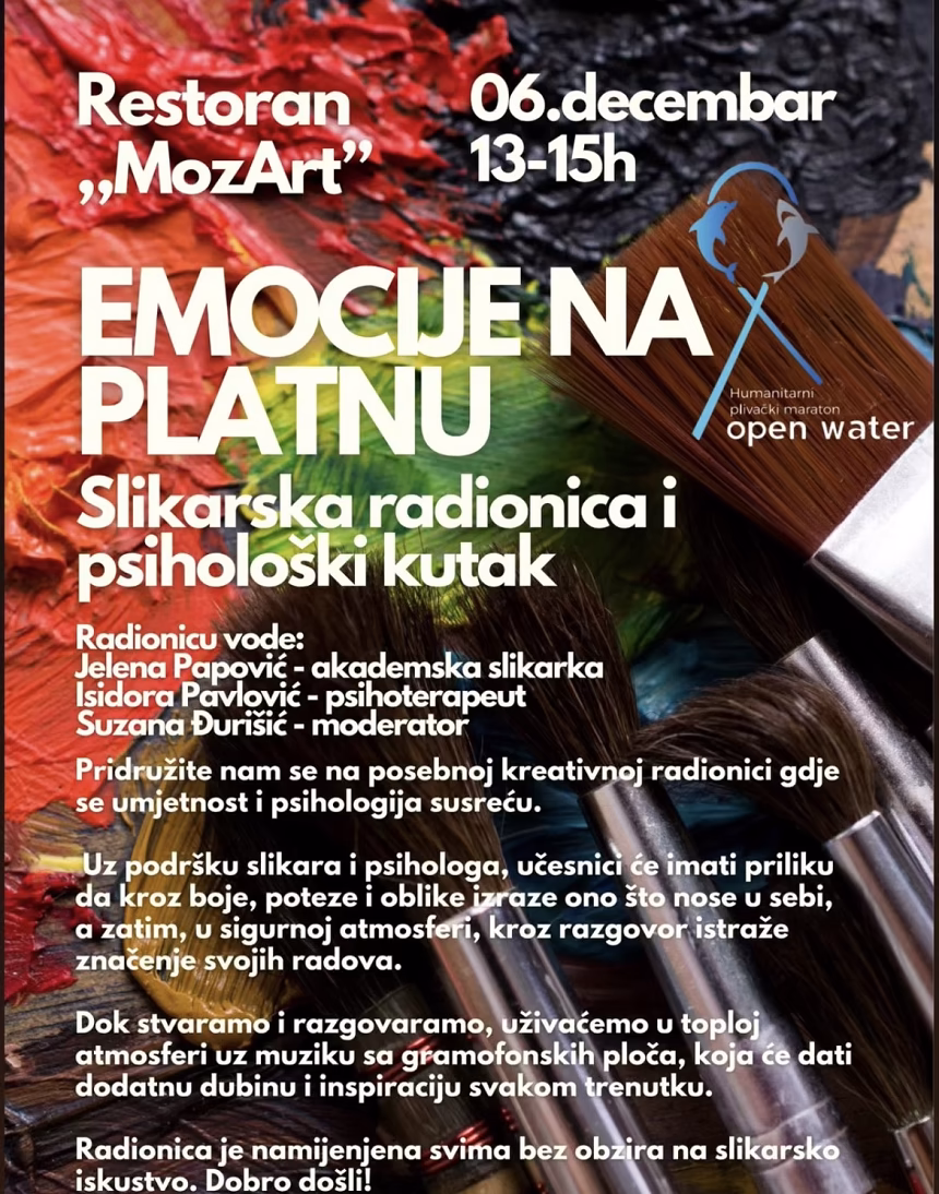Događaj, koji će održati 6. decembra od 13 do 15 časova, objedinjuje umjetnički i psihološki pristup, omogućavajući učesnicima da istraže svoje emocije kroz boje, oblike i poteze četkice.