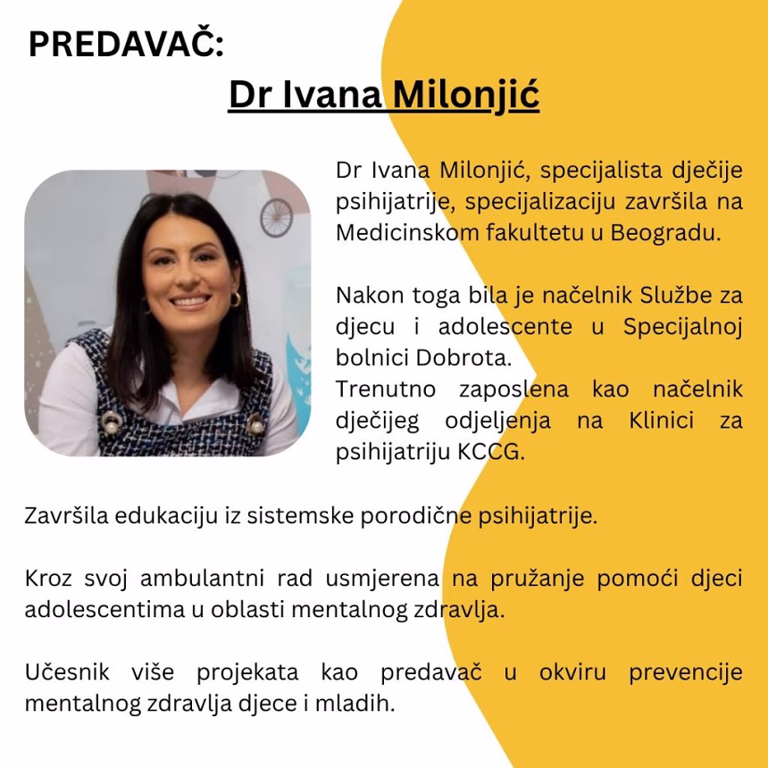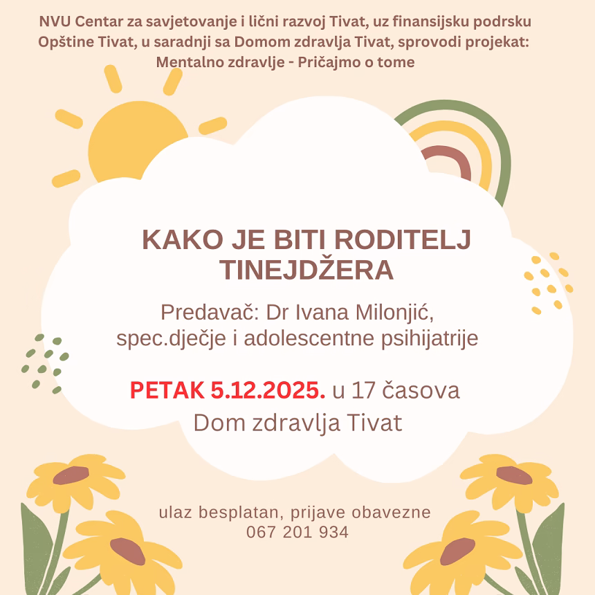 Tinejdžerski period može biti izazovan za roditelje, tada se jos uvijek razvija identitet djeteta, a emocionalni problemi u ovoj razvojnoj fazi mogu da eskaliraju. Na ovoj radionici, dr Ivana Milonjić će podijeliti stručne savjete o tome kako bolje razumjeti i podržati svoje tinejdžere.