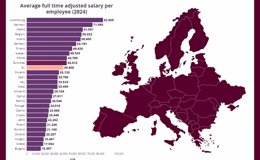 Prosječna godišnja plata po zaposlenom u Evropskoj uniji iznosi 39.808 eura. Među državama članicama kreće se od 15.387 eura u Bugarskoj do 82.969 eura u Luksemburgu, što je čak 5,4 puta više, prenosi N1.
