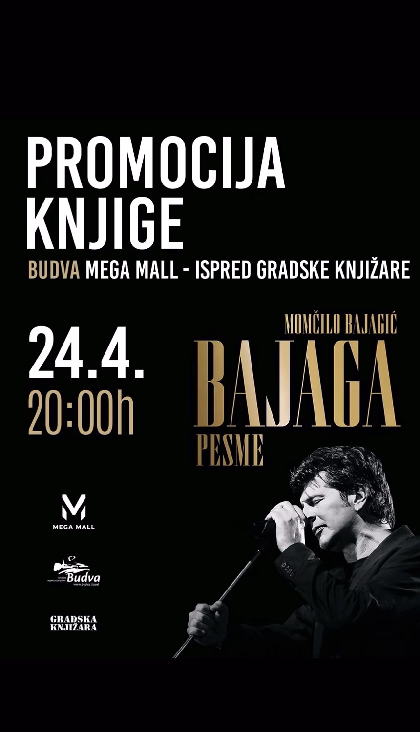 Budvanska kulturna scena biće u petak, 24. aprila, u znaku jednog od najznačajnijih muzičara našeg regiona. Sa početkom u 20 časova, u Mega molu ispred Gradske knjižare, održaće se promocija i potpisivanje ekskluzivne monografije „Pesme“ autora Momčila Bajagića Bajage. Ovaj događaj rezultat je zajedničke saradnje Mega mola, Gradske knjižare i Turističke organizacije Budve, a osmišljen je kao jedinstven susret ljubitelja književnosti i muzike sa autorom čiji su stihovi obilježili prethodne četiri decenije.